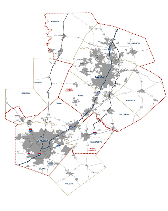 The Capital-Alamo Connections Study is a joint effort between TxDOT, CAMPO, and the Alamo Area MPO (AAMPO) to develop a strategy for mobility improvements within the greater Austin-San Antonio region. The study covered a 12-county region and covered all counties represented by CAMPO and AAMPO, Bastrop, Bexar, Burnet, Caldwell, Comal, Guadalupe, Hays, Kendall, Travis, and Williamson counties, as well as Blanco and Wilson counties. This study was developed to plan for the extreme growth expected in Central Texas, particularly along the IH-35 corridor between Austin and San Antonio, and looks for possible solutions to current rates of congestion as well as opportunities to improve mobility.
