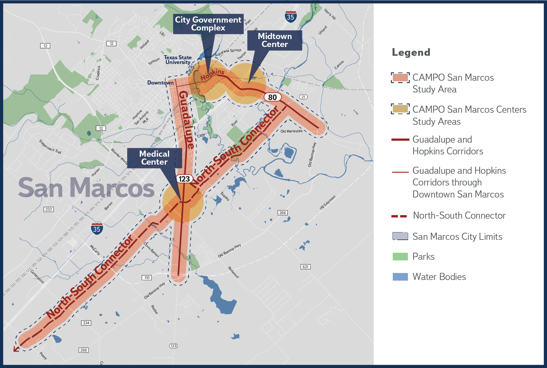 The Capital Area Metropolitan Planning Organization (CAMPO) and the City of San Marcos partnered on the San Marcos Transportation Corridors Study to plan for future needs and improvements along three key roadways in the area. Completed in 2022, the City is using the recommendations from the study to implement various improvements. View the final report and recommendations.